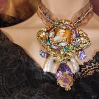 perles naturelles d'eau douce , pierres dures et fines, apprêts anciens , cristaux, dentelle de Venise entièrement rebrodée de perles et de pierres.
